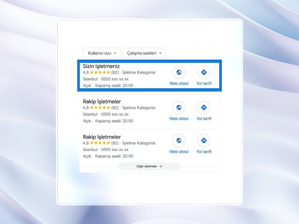 İşletmenizin Google Haritalardaki mevcut durumu ve rekabet seviyesi detaylı olarak analiz edilir.
